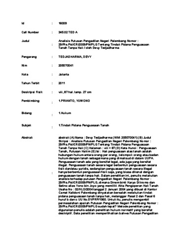 DEVY, TEDJADHARMA (2011) nalisis Putusan Pengadilan Negeri Palembang Nomor : 29/Pts.Pid/CR/2009/PN/PLG Tentang Tindak Pidana Penguasaan Tanah Tanpa Hak / oleh Devy Tedjadharma. Skripsi thesis, UNIVERSITAS TARUMANAGARA.