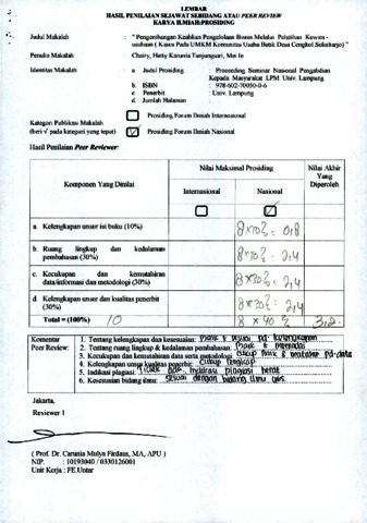 Chairy, Reviewer and Hetty Karunia Tunjungsari, Reviewer and Mei Ie, Reviewer (2013) Review B21. Chairy, Hetty Karunia Tunjungsari, Mei Ie. Review. " Pengembangan Keahlian Pengelolaan Bisnis Melalui Pelatihan Kewira - usahaan ( Kasus Pada UMKM Komunitas Usaha Batik Desa Cengkol Sukoharjo ) ”. ISSN 978-602-70050-0-6