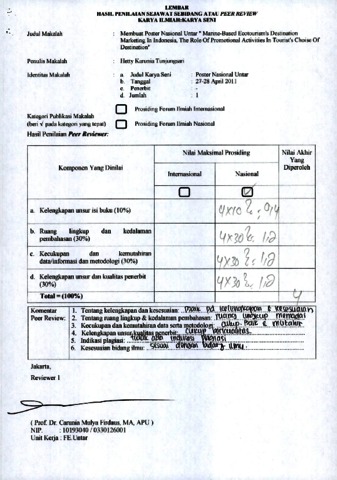 Hetty Karunia Tunjungsari, Reviewer (2011) Review B27. Hetty Karunia Tunjungsari. Review. Membuat Poster Nasional Untar " Marine-Based Ecotourism's Destination Marketing In Indonesia, The Role Of Promotional Activities In Tourist's Choise Of Destination".