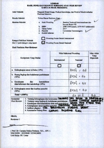 Tobias Hansel Budiono, Review and Keni Keni, Review (2017) Review B29. Tobias Hansel Budiono, Keni. Review. Pengaruh Brand Image, Product Knowledge, dan Word of Mouth terhadap Purchase Intention. ISSN 2089-1040 (cetak), 2579-9517 (elektronik)