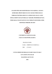 Marcella, Christiana (2018) Analisis pengaruh kepemilikan manajerial, ukuran komisaris, profitabilitas dan ukuran perusahaan terhadap keterlambatan laporan keuangan audit dengan reputasi KAP sebagai variabel pemoderasi pada perusahaan manufaktur yang terdaftar di BEI periode 2013-2017. /Christiana Marcella. Masters thesis, Universitas Tarumanagara.