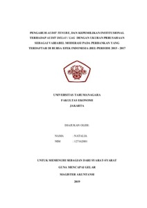 Natalia, Natalia (2019) Pengaruh audit tenure, dan kepemilikan institusional terhadap audit delay / lag dengan ukuran perusahaan sebagai variabel moderasi pada perbankan yang terdaftar di BEI periode 2015-2017. /Natalia. Masters thesis, Universitas Tarumanagara.