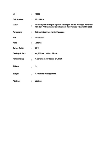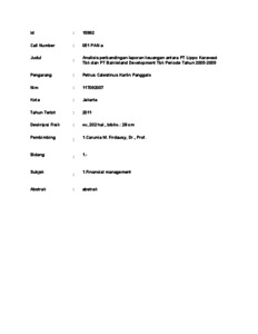 Karlin Panggalo, Petrus Calestinus (2011) Analisis perbandingan laporan keuangan antara PT Lippo Karawaci,Tbk dan PT Bakrieland Development Tbk Periode Tahun 2005-2009. Masters thesis, Universitas Tarumanagara.
