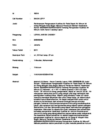 Lepun, Aaron Cassidy (2011) Pelaksanaan Pengawasan Kualitas Air Pada Depot Air Minum Isi Ulang Wilayah Kota Bogor Menurut Peraturan Menteri Kesehatan Nomor 492/MENKES/PER/IV/2010 Tentang Persyaratan Kualitas Air Minum. Skripsi thesis, Universitas Tarumanagara.