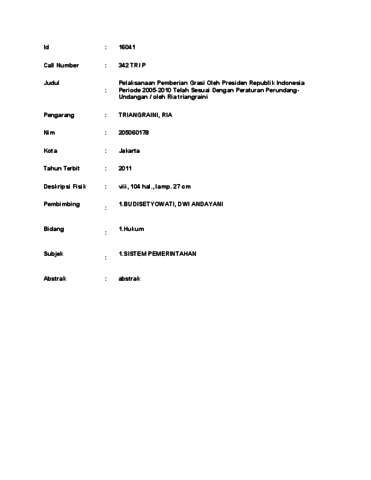 Trianggraini, Ria (2011) Pelaksanaan Pemberian Grasi Oleh Presiden Republik Indonesia Periode 2005-2010 Telah Sesuai Dengan Peraturan PerundangUndangan. Skripsi thesis, Universitas Tarumanagara.