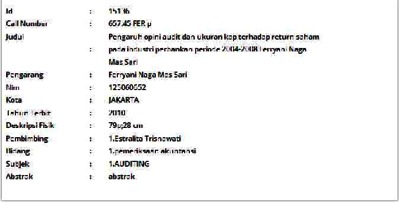 Naga Mas Sari, Ferryani (2010) Pengaruh opini audit dan ukuran kap terhadap return saham pada industri perbankan periode 2004-2008. Skripsi thesis, Universitas Tarumanagara.