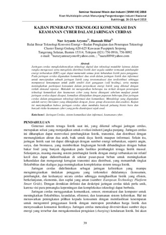 Jaringan cerdas mengkolaborasikan teknologi digital dan teknologi mutakhir lainnya dalam rangka mengawasi serta mengelola distribusi listrik dari segala sumber termasuk pembangkit energi terbarukan (EBT) agar dapat memenuhi semua jenis kebutuhan listrik para pengguna. Pada jaringan cerdas digunakan komunikasi dua arah dalam jaringan listrik dan informasi untuk menciptakan sebuah jaringan listrik yang terotomatisasi dan terdistribusi sehingga mempunyai kemampuan untuk pulih sendiri dari gangguan (self healing), serta mampu meningkatkan partisipasi konsumen dalam penyediaan energi listrik yang dikenal dengan istilah demand reponse. Makalah ini menguraikan beberapa isu terkait dengan penerapan teknologi komunikasi dan keamanan cyber yang harus ditangani sebelum manfaat penuh jaringan cerdas dapat dicapai, kemudian dilanjutkan dengan paparan beberapa fitur jaringan cerdas dalam penggunaan teknologi informasi dan komunikasi. Metodologi yang digunakan adalah survey literature yang dilanjutkan dengan focus group discussion dan analisis. Kajian ini menyimpulkan bahwa jaringan cerdas akan membuka banyak peluang bisnis baru dan banyak risiko keamanan cyber yang perlu diantisipasi sejak awal.