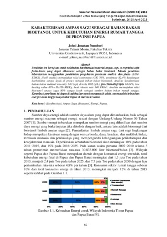 Numberi, Johni Jonatan (2018) KARAKTERISASI AMPAS SAGU SEBAGAI BAHAN BAKAR BIOETANOL UNTUK KEBUTUHAN ENERGI RUMAH TANGGA DI PROVINSI PAPUA. In: Prosiding Seminar Nasional Mesin dan Industri (SNMI ) XII 2018. Universitas Tarumanagara, pp. 87-95. ISBN 978-602-71459-9-3