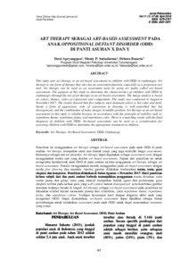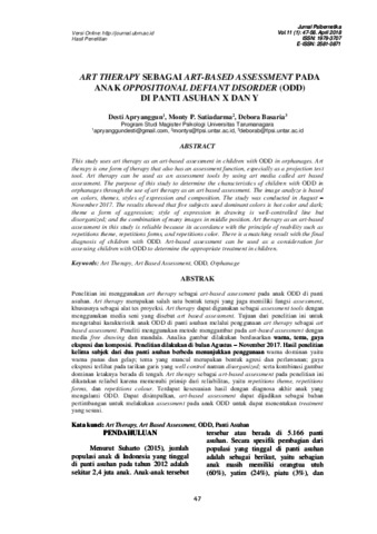 Desti, Apryanggun and Monty P., Satiadarma and Debora, Basaria (2017) ART THERAPY SEBAGAI ART-BASED ASSESSMENT PADA ANAK OPPOSITIONAL DEFIANT DISORDER (ODD) DI PANTI ASUHAN X DAN Y. ART THERAPY SEBAGAI ART-BASED ASSESSMENT PADA ANAK OPPOSITIONAL DEFIANT DISORDER (ODD) DI PANTI ASUHAN X DAN Y, 11 (1). pp. 47-56. ISSN ISSN: 1979-3707