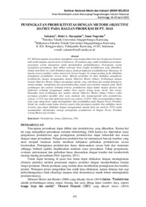 Sukanta, Sukanta and Darajatun, Rizki A. and Nugraha, Iman (2018) Peningkatan Produktivitas Dengan Metode Objective Matrix Pada Bagian Produksi Di PT. Mas. In: Prosiding Seminar Nasional Mesin dan Industri (SNMI ) XII 2018. Universitas Tarumanagara, pp. 191-200. ISBN 978-602-71459-9-3