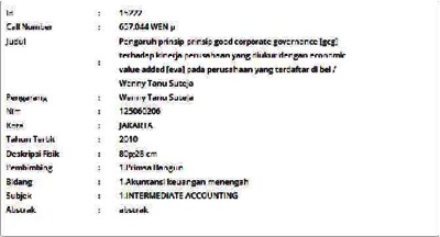 Tanu Suteja, Wenny (2010) Pengaruh prinsip-prinsip good corporate governance [gcg] terhadap kinerja perusahaan yang diukur dengan economic value added [eva] pada perusahaan yang terdaftar di bei. Skripsi thesis, Universitas Tarumanagara.