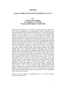 Jembatan Tayan terletak pada 112 km dari kota Pontianak, pada ruas Jalan Poros / Lintas Selatan Kalimantan yang menghubungkan Provinsi Kalimantan Barat dengan Kalimantan Tengah. Jembatan ini terdiri atas 2 (dua) jembatan dengan panjang total 1.420 m dan lebar 11 m. Pada tahun 2015, profil I pada hanger jembatan Tayan mengalami getaran yang diperkirakan berbahaya bagi keselamatan jembatan. Getaran yang terjadi berupa osilasi dalam arah torsional dan hanya terjadi pada kondisi-kondisi kecepatan angin tertentu saja serta pada beberapa buah hanger saja. Getaran pada hanger/kabel penggantung merupakan fenomena yang sering terjadi khususnya pada hanger dengan profil H. Fenomena getaran yang terjadi pada kabel hanger dapat disebabkan oleh 3 kemungkinan fenomena angin dinamik, antara lain : Vortex Induced Vibration (VIV), Galloping, dan Flutter. Banyaknya kemungkinan fenomena angin dinamik yang mungkin terjadi pada struktur jembatan, maka perlu dilakukan pengujian dan analisis terlebih dahulu untuk mengetahui fenomena aerodinamik yang berpengaruh terhadap getaran pada hanger/kabel penggantung pada Jembatan Tayan. Analisis dilakukan dengan memodelkan struktur hanger jembatan Tayan dengan bantuan program Finite Element. Hasil analisis yang diperoleh berupa frekuensi alami struktur lalu dibandingkan dengan frekuensi getaran vortex. Hasil menunjukkan bahwa frekuensi alami struktur sesuai dengan frekuensi getar vortex dan menyebabkan getaran pada hanger akibat resonansi. Alternatif solusi yang dirumuskan harus sesuai dengan penyebab getaran, sehingga dilakukan analisis terhadap beberapa solusi. Metode perbaikan yang dianalisis yaitu dengan membungkus profil dengan bentuk lain yang lebih aerodinamis, seperti persegi, lingkaran dan hexagonal. Metode lain yaitu dengan memberi pengikat antar hanger dengan struts cable yang bertujuan untuk memperpendek bentang jembatan sehingga dapat mengurangi getaran. Rekomendasi solusi akhir yang dipilih, yaitu dengan menggunakan struts cable, karena pengerjaan yang relatif lebih mudah dan paling efisien dalam mengatasi getaran vortex dibandingkan dengan alternatif solusi lainnya.