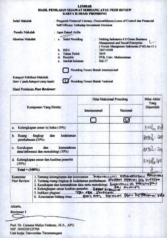 Agus Zainul Arifin, peer review (2019) Reviewer B.23 Agus Zainul Arifin. Pengaruh Financial Literacy, Overconfidence, Locus of Control dan Financial Self Efficacy Terhadap Investment Decision ". ISSN 2407 - 0548