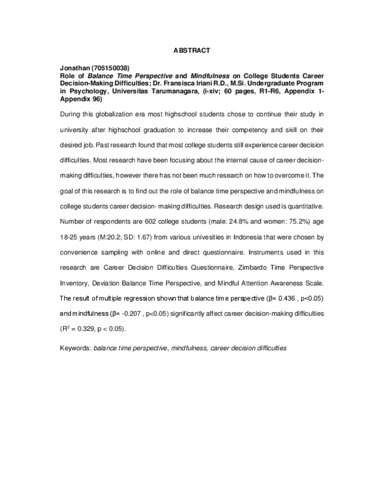 Jonathan, Jonathan (2020) Peran Balance Time Perspective dan Mindfulness Terhadap Kesulitan Keputusan Karir Mahasiswa. Skripsi thesis, Universitas Tarumanagara.
