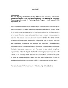Adelia, Cindy (2020) Peranan kualitas kehidupan sekolah (Quality of School Life) terhadap motivasi belajar pada siswa SMA X. Skripsi thesis, Universitas Tarumanagara.