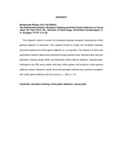 Penelitian ini bertujuan untuk mengkaji hubungan antara sensation seeking dengan adiksi game online di Indonesia. Penelitian dilaksanakan dengan metode kuantitatif, pengambilan data dilaksanakan melalui kuesioner. Kuesioner yang digunakan adalah Sensation Seeking Scale (SSS) dan Kuesioner Adiksi Game Online Indonesia. Partisipan adalah 252 orang dewasa muda yang memiliki keterlibatan dengan game online dan telah disortir dengan kriteria adiksi game online. Hasil penelitian menunjukkan bahwa sensation seeking memiliki hubungan positif dengan adiksi game online dengan nilai r = .220, p < .01.