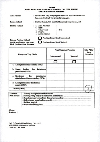 Dra. Nur Hidayah,MM, Review and Drs.Muhammad Tony Nawawi,MM, Review (2012) Reviewer jurnal B.22 Dra.Nur Hidayah,MM., Drs.Muhammad Tony Nawawi,MM. Faktor-Faktor Yang Mempengaruhi Pemilihan Produk Kosmetik Pada Karyawati Muslimah Universitas Tarumanagara.