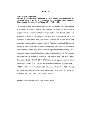 Kata Kunci : kepuasan kerja, kualitas kehidupan, guru, sekolah