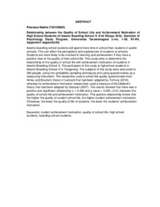 Siswa pesantren akan menghabiskan waktu lebih banyak di sekolah dibandingkan siswa yang bersekolah di sekolah umum. Hal ini dapat memengaruhi pandangan dan pengalaman siswa di sekolahnya. Siswa cenderung lebih terlibat dalam pembelajaran dan prestasi jika mereka memiliki pandangan yang positif mengenai kualitas kehidupan sekolahnya. Penelitian ini bertujuan untuk mengetahui hubungan kualitas kehidupan sekolah dengan motivasi berprestasi siswa SMA Pesantren X. Sekolah yang menjadi subyek penelitian ini adalah pesantren X di Tangerang. Subyek penelitian ini berjumlah