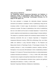 Hartopo, Tiffany (2020) Hubungan Motivasi Forgiveness dan Resiliensi pada Remaja Korban Cyberbullying. Skripsi thesis, Universitas Tarumanagara.