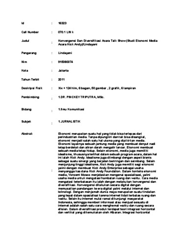 Lindayani, Lindayani (2011) Konvergensi Dan Diversifikasi Acara Talk Show (Studi Ekonomi Media Acara Kick Andy). Skripsi thesis, Universitas Tarumanagara.