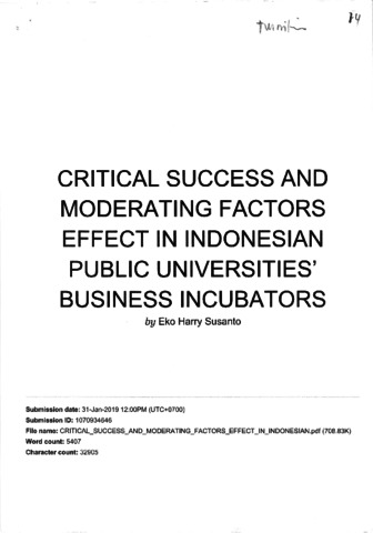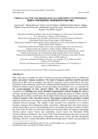 Gozali, Lina and Masrom, Maslin and Yuri M.Sagloel, Teuku and Norehan Haron, Habibah and Dahlan, Dahmir and Jusuf Daywin, Frans and Saryatmo Agung, Mohammad and Saraswati, Docki and Fitri Syamas, Asril and Susanto, Eko Harry (2018) Critical Success and Moderating Factors Effect In Indonesia Public Universities' Business Incubators. International Journal of Technology, 5 (9). pp. 1049-1060. ISSN 2086-9614