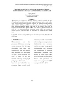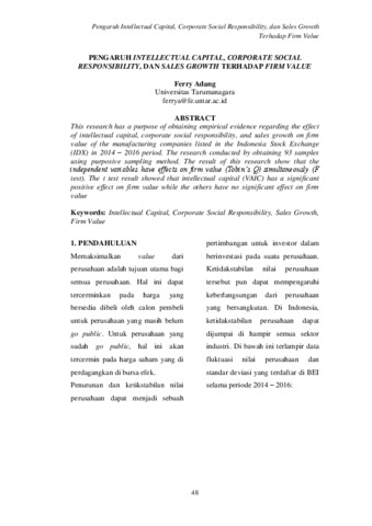 ferry Adang, Ferry Adang (2019) Dokumen B.3 Ferry Adang. Pengaruh Intellectual Capital, Corporate Social Responsibility, dan Sales Growth Terhadap Firm Value, 6 (1). pp. 48-75. ISSN 2338-1132