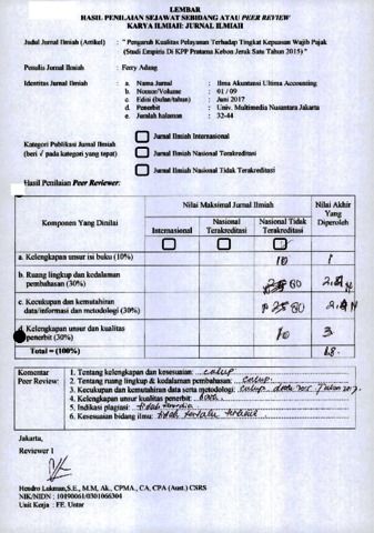 ferry Adang, Reviewer (2017) Reviewer B.1 Ferry Adang. ” Pengaruh Kualitas Pelayanan Terhadap Tingkat Kepuasan Wajib Pajak (Studi Empiris Di KPP Pratama Kebon Jeruk Satu Tahun 2015 ", 9 (1). pp. 32-44. ISSN 2085-4595