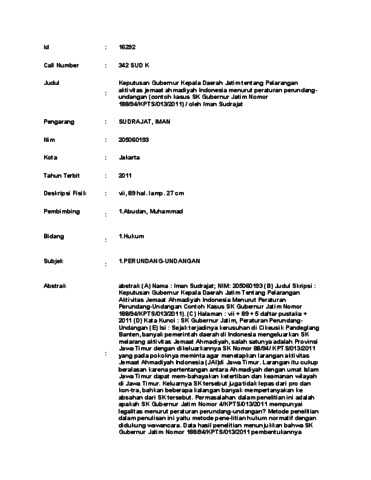 Sudrajat, Iman (2011) Keputusan Gubernur Kepala Daerah Jatim tentang Pelarangan aktivitas jemaat ahmadiyah Indonesia menurut peraturan perundangundangan (contoh kasus SK Gubernur Jatim Nomor 188/94/KPTS/013/2011). Skripsi thesis, Universitas Tarumanagara.