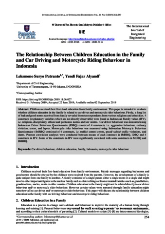 Putranto, Leksmono Suryo and Alyandi, Yendi Fajar (2019) The Relationship Between Children Education in the Family and Car Driving and Motorcycle Riding Behaviour in Indonesia. International Journal of Integrated Engineering, 11 (6). pp. 254-267. ISSN 2600-7916