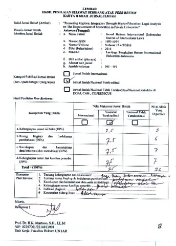 Gunadi, Ariawan (2016) Peer Review Promoting Regional Integration Throught Higher Education: Legal Analysis on The Empowerment of Foundation in Private Universities. Lembaga Pengkajian Hukum Internasional FH UI.