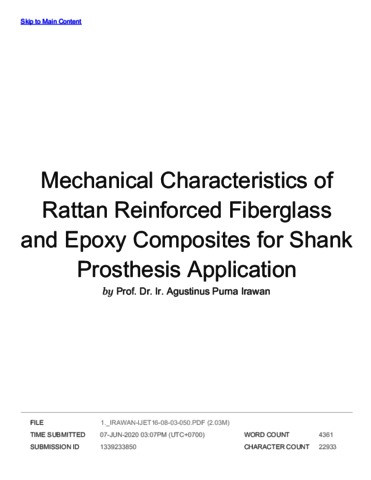 Purna Irawan, Agustinus (2016) Turnitin: Mechanical Characteristics of Rattan Reinforced Fiberglass and Epoxy Composites for Shank Prosthesis Application. International Journal of Engineering and Technology, 8 (3). ISSN 0975-4024