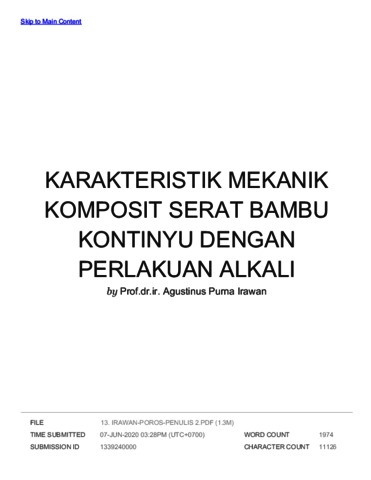 Djamil, Sofyan and Purna Irawan, Agustinus (2017) Turnitin : Karakteristik Mekanik Komposit Serat Bambu Kontinyu Dengan Perlakuan Alkali. Jurnal Poros, 15 (1). ISSN 1410-6841