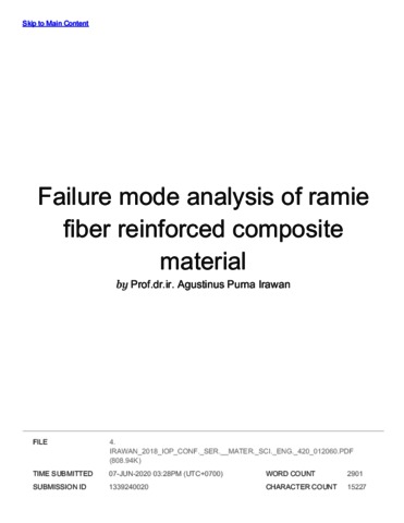 Purna Irawan, Agustinus (2018) Turnitin : Failure Mode Analysis of ramie fiber reinforced composite material. 2nd Nommensen International Conference on Technology and Engineering 2018. ISSN 1757899X