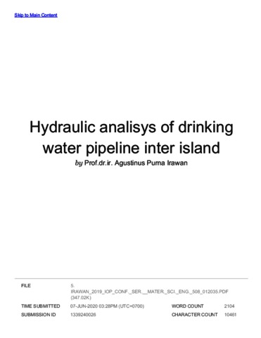 Suyono, Tri and Asriningsih Pranoto, Wati and Purna Irawan, Agustinus (2019) Turnitin : Hydraulic analysis of drinking water pipeline inter island. TICATE 2018. ISSN 1757899X