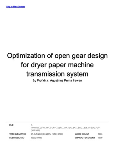 12. Turnitin Prosiding Terindek Scopus-Optimization of open gear design for dryer paper machine transmission system.pdf Download (1MB) | Preview |