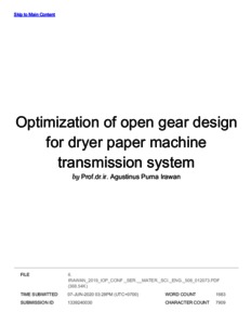 Renaldo, Renaldo and Purna Irawan, Agustinus and Halim, Agus (2019) Turnitin : Optimization of open gear design for dryer paper machine transmission system. TICATE 2018. ISSN 1757899X