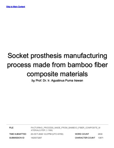 Purna Irawan, Agustinus and Sukania, I Wayan and Anggarina, Paula Tjatoerwidya and Raditya Danendra, Albertus and Dimas Baskara, Gregorius (2020) Turnitin : Socket prosthesis manufacturing process made from bamboo fiber composite materials. 2nd TICATE 2019. ISSN 1757899X