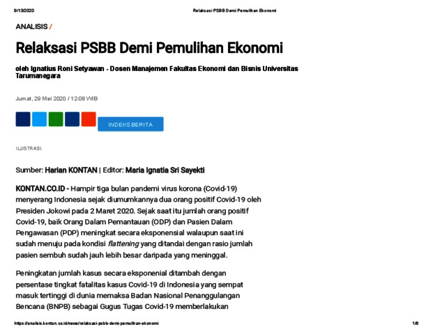 Setyawan, Ignatius Roni Relaksasi PSBB Demi Pemulihan Ekonomi. Relaksasi PSBB Demi Pemulihan Ekonomi.