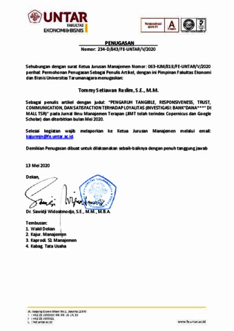 Ruslim, Tommy Setyawan and Rahardjo, Mukti and Siswanto, Halim Putera PENGARUH TANGIBLE, RESPONSIVENESS, TRUST, COMMUNICATION, DAN SATISFACTION TERHADAP LOYALITAS (INVESTIGASI: BANK “DANA***” DI MALL “TSR”). PENGARUH TANGIBLE, RESPONSIVENESS, TRUST, COMMUNICATION, DAN SATISFACTION TERHADAP LOYALITAS (INVESTIGASI: BANK “DANA***” DI MALL “TSR”).