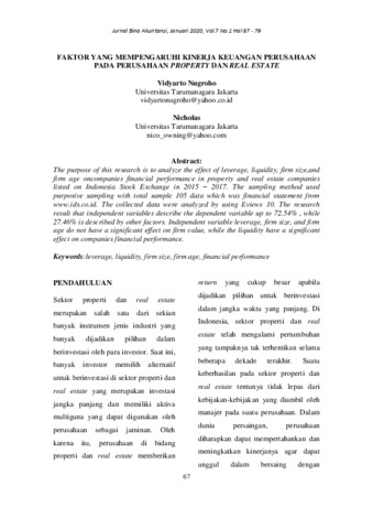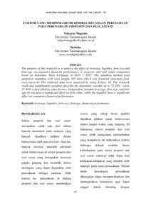 Nugroho, Vidyarto and Nicholas, Nicholas FAKTOR YANG MEMPENGARUHI KINERJA KEUANGAN PERUSAHAAN PADA PERUSAHAAN PROPERTY DAN REAL ESTATE. FAKTOR YANG MEMPENGARUHI KINERJA KEUANGAN PERUSAHAAN PADA PERUSAHAAN PROPERTY DAN REAL ESTATE.