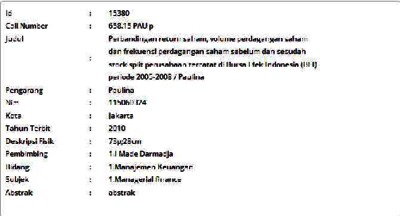 Paulina, Paulina (2010) Perbandingan return saham, volume perdagangan saham dan frekuensi perdagangan saham sebelum dan sesudah stock split perusahaan tercatat di Bursa Efek Indonesia (BEI) periode 2005-2008. Skripsi thesis, Universitas Tarumanagara.
