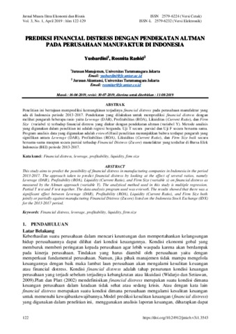 Yusbardin, Review PREDIKSI FINANCIAL DISTRESS DENGAN PENDEKATAN ALTMAN PADA PERUSAHAAN MANUFAKTUR DI INDONESIA. PREDIKSI FINANCIAL DISTRESS DENGAN PENDEKATAN ALTMAN PADA PERUSAHAAN MANUFAKTUR DI INDONESIA.