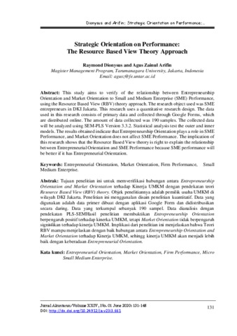 Dionysus, Raymond and Arifin, Agus Zainul Strategic Orientation on Performance: The Resource Based View Theory Approach. Strategic Orientation on Performance: The Resource Based View Theory Approach.