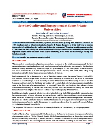 Aritonang, Lerbin R and Mularsih, Heni Service Quality and Engagement at Some Private Universities. Service Quality and Engagement at Some Private Universities.