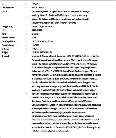 A. Nama: Alberth Tamaela (NIM: 205040062). B. Judul Skripsi: Perbandingan Sistem Pemilihan Umum Menurut Undang-Undang Nomor 12 Tahun 2003 Dengan Undang-Undang Nomor 10 Tahun 2008 dalam Rangka Menghasilkan Wakil Rakyat Yang Legitimed C. Halaman: viii + 71 + 3 + 2010. D. Kata Kunci: Perbandingan, Sistem Pemilihan Umum. E. Isi: Cara menghasilkan seorang anggota legislatif di Indonesia adalah dengan melakukan Pemilihan umum (Pemilu). Pemilu dalam hal ini dilakukan diseluruh Indonesia dengan cara pemungutan suara langsung. Pada Pemilu tahun 2004, baik Pemilu Legislatif maupun Pemilu Presiden dapat berjalan dengan lancar, bahkan Indonesia mendapat pujian dari masyarakat international, yaitu berupa penyerahan medali demokrasi kepada Presiden Susilo Bambang Yudoyono dari International Association of Political Consultant (IAPC). Adapun keberhasilan Pemilu tahun 2004, terdapat adanya perbedaan dengan Pemilu tahun 2009, walaupun terdapat perbedaan-perbedaan tetapi juga terdapat persamaan-persamaannya. Untuk mengetahui persamaan dan perbedaan tersebut penulis menggunakan metode penelitian hukum normatif, yaitu melalui bahan hukum premier, bahan hukum sekunder serta bahan hukum tersier. F. Acuan: 26 (1983-2009). G. Pembimbing: Rasji, S.H., M.H. H. Penulis: Alberth Tamaela
