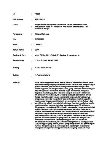 Wijaya, Martinus (2011) Kegiatan Marketing Public Relations Dalam Membentuk Citra Perusahaan Pada PT. Millenium Pharmacon International, Tbk. Skripsi thesis, Universitas Tarumanagara.
