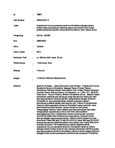 Novia, Jessie (2011) Kedudukan hukum penderita sindrom klinefelter sebagai pelaku tindak pidana pemalsuan identitas dalam akta otentik dan tindak pidana penipuan (contoh kasus Alterima Hofan). Skripsi thesis, Universitas Tarumanagara.