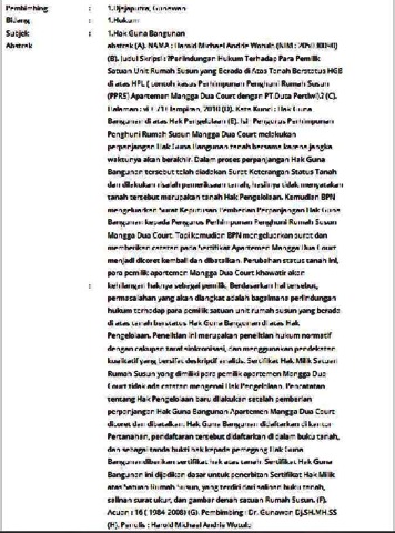 (A). NAMA : Harold Michael Andrie Wotulo (NIM : 205030090) (B). Judul Skripsi : ?Perlindungan Hukum Terhadap Para Pemilik Satuan Unit Rumah Susun yang Berada di Atas Tanah Berstatus HGB di atas HPL ( contoh kasus Perhimpunan Penghuni Rumah Susun (PPRS) Apartemen Mangga Dua Court dengan PT.Duta Pertiwi).? (C). Halaman : vi + 71+ lampiran, 2010 (D). Kata Kunci : Hak Guna Bangunan di atas Hak Pengelolaan (E). Isi : Pengurus Perhimpunan Penghuni Rumah Susun Mangga Dua Court melakukan perpanjangan Hak Guna Bangunan tanah bersama karena jangka waktunya akan berakhir. Dalam proses perpanjangan Hak Guna Bangunan tersebut telah diadakan Surat Keterangan Status Tanah dan dilakukan risalah pemeriksaan tanah, hasilnya tidak menyatakan tanah tersebut merupakan tanah Hak Pengelolaan. Kemudian BPN mengeluarkan Surat Keputusan Pemberian Perpanjangan Hak Guna Bangunan kepada Pengurus Perhimpunan Penghuni Rumah Susun Mangga Dua Court. Tapi kemudian BPN mengeluarkan surat dan memberikan catatan pada Sertifikat Apartemen Mangga Dua Court menjadi dicoret kembali dan dibatalkan. Perubahan status tanah ini, para pemilik apartemen Mangga Dua Court khawatir akan kehilangan haknya sebagai pemilik. Berdasarkan hal tersebut, permasalahan yang akan diangkat adalah bagaimana perlindungan hukum terhadap para pemilik satuan unit rumah susun yang berada di atas tanah berstatus Hak Guna Bangunan di atas Hak Pengelolaan. Penelitian ini merupakan penelitian hukum normatif dengan cakupan taraf sinkronisasi, dan menggunakan pendekatan kualitatif yang bersifat deskriptif analitis. Sertifikat Hak Milik Satuan Rumah Susun yang dimiliki para pemilik apartemen Mangga Dua Court tidak ada catatan mengenai Hak Pengelolaan. Pencatatan tentang Hak Pengelolaan baru dilakukan setelah pemberian perpanjangan Hak Guna Bangunan Apartemen Mangga Dua Court dicoret dan dibatalkan. Hak Guna Bangunan didaftarkan di kantor Pertanahan, pendaftaran tersebut didaftarkan di dalam buku tanah, dan sebagai tanda bukti hak kepada pemegang Hak Guna Bangunandiberikan sertifikat hak atas tanah. Sertifikat Hak Guna Bangunan ini dijadikan dasar untuk penerbitan Sertifikat Hak Milik atas Satuan Rumah Susun, yang terdiri dari salinan buku tanah, salinan surat ukur, dan gambar denah satuan Rumah Susun. (F). Acuan : 16 ( 1984-2008) (G). Pembimbing : Dr. Gunawan Dj.SH.MH.SS (H). Penulis : Harold Michael Andrie Wotulo