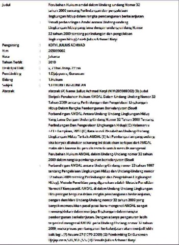 (A) Nama: Julius Achmad Kotyi (NIM:205069002) (B) Judul Skripsi : Perubahan Hukum AMDAL Dalam Undang-Undang Nomor 32 Tahun 2009 tentang Perlindungan dan Pengelolaan Lingkungan Hidup Dalam Rangka Pembangunan Berkelanjutan (Studi Perbandingan AMDAL Antara Undang-Undang Lingkungan Hidup Yang Lama Dengan Undang-Undang Nomor 32 Tahun 2009 Tentang Perlindungan Dan Pengelolaan Lingkungan Hidup) (C) Halaman: v +73 + Lampiran, 2010 (D) Kata kunci: Perubahan Undang-Undang Lingkungan Hidup Terkait AMDAL (E) Isi: Pembangunan yang sedang kita banyak dilakukan sekarang ini tidak akan terlepas dari AMDAL maka oleh karena itu penulis tertarik untuk menulis mengenai Perubahan Hukum AMDAL dalam Undang-Undang nomor 32 tahun 2009 dalam rangka pembangunan berkelanjutan (Studi Perbandingan AMDAL antara Undang-Undang nomor 23 tahun 1997 tentang Pengelolaan Lingkungan Hidup dan Undang-Undang nomor 32 tahun 2009 tentang Perlindungan dan Pengelolaan Lingkungan Hidup). Metode Penelitian yang digunakan adalah Metode Penelitian Normatif Komparatif. AMDAL di dalam Undang-Undang Lingkungan Hidupsangat berguna dalam rangka pembangunan berkelanjutan, dengan demikian Undang-Undang nomor 32 tahun 2009 yang banyak memasukkan pasal-pasal baru mengenai AMDAL sangat memungkinkan dalam menjaga lingkungan dalam rangka pembangunan berkelanjutan. Dengan adanya pengaturan lebih terperinci mengenai AMDAL pada Undang-Undang nomor 32 tahun 2009, maka proses pembangunan berkelanjutan akan menjadi lebih baik lagi . (F) Acuan: 27 (1979-2009) (G) Pembimbing Dr.Gunawan Djajaputera,S.H.,M.H.,S.S. (H) Penulis Julius Achmad Kotyi